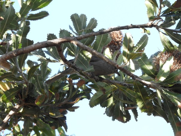 This is the first time I’ve spotted one of these birds. I think it’s a Grey Shrike-thrush. Neat and tidy, with understated grey plumage. The bird took great care to remain hidden behind the leaves and branches of a Banksia. I snapped a shot when it peeped out to see if I was still around: