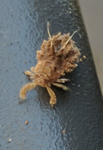 Last year, another odd little bug paid a call. This one was very small indeed. It’s on the armrest of a garden chair: