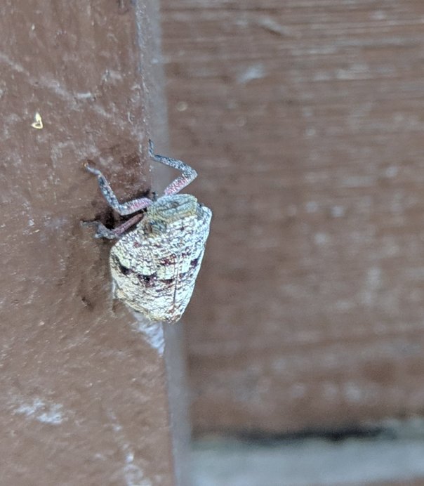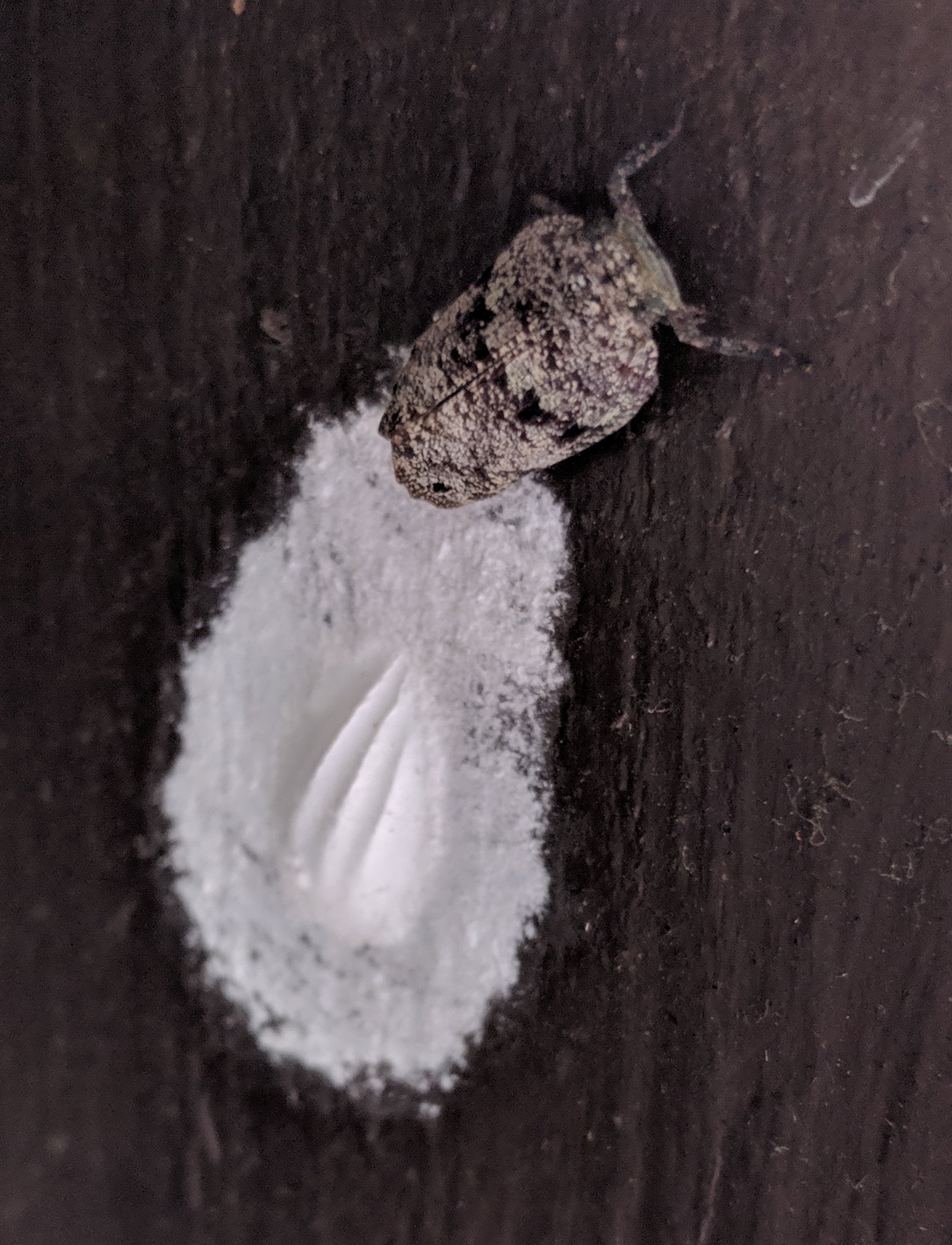 The bug was on a wooden wall, and spent quite a bit of time around a patch of white stuff with a hump in the middle of it. Perhaps a clutch of eggs? I didn’t see whether the bug spewed out the white stuff, but it did spend time wiggling its abdomen above it.