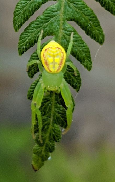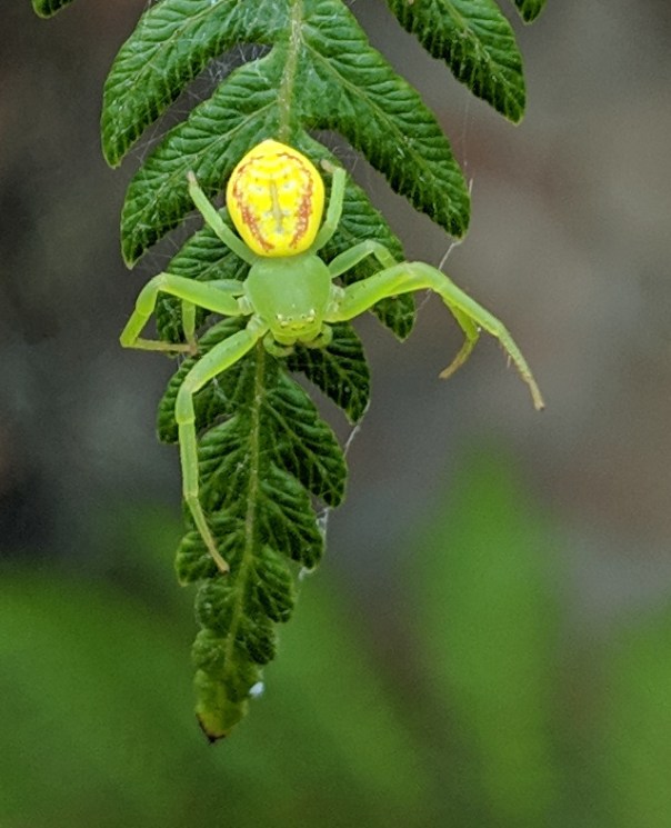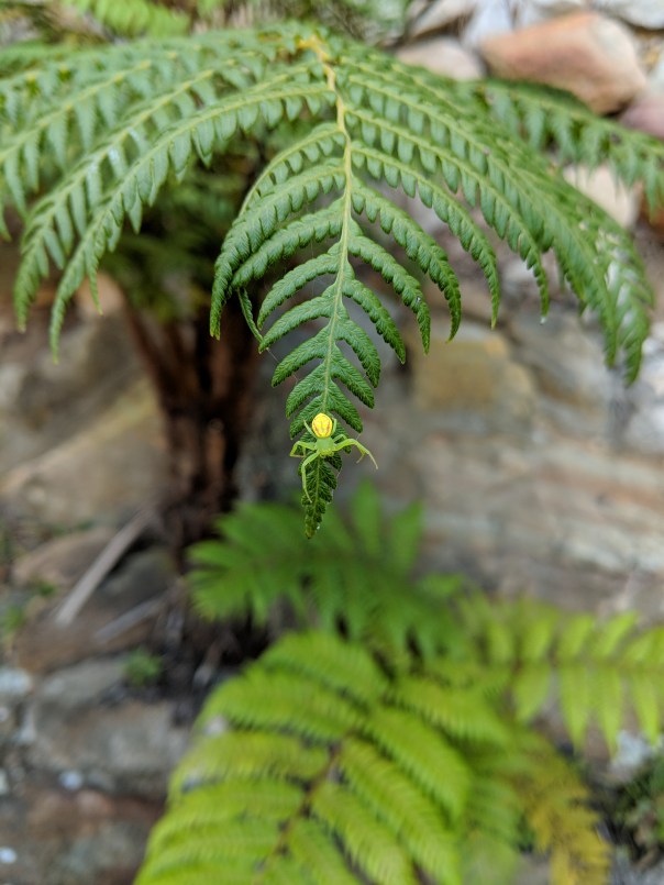 Not all Australian spiders are big and scary. This little creature is a Flower Spider, also known as a Crab Spider. It’s perched on a tree fern: