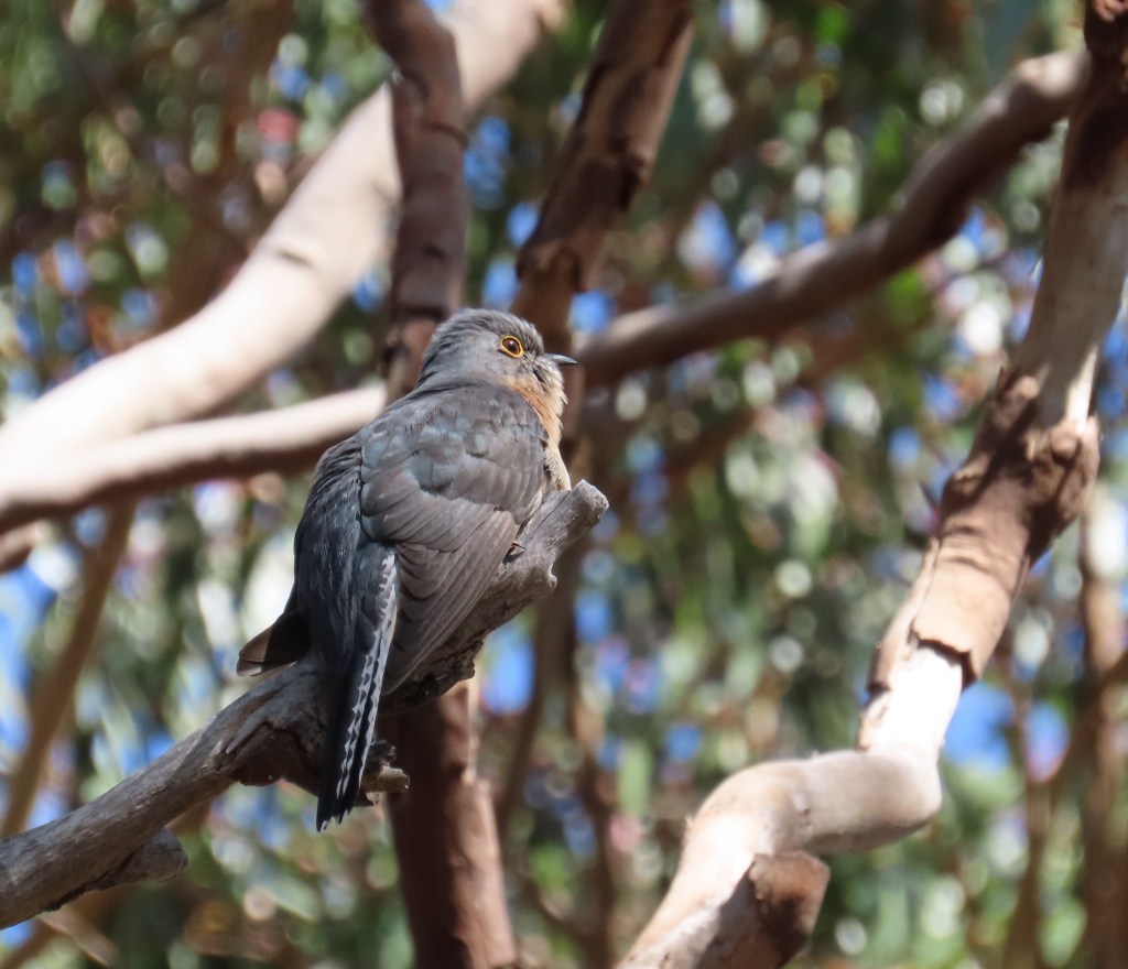 Adult Fan-tailed Cuckoos have a prominent yellow ring around the eye, as does this one. The bird is sitting huddled down on the end of a branch, perhaps enjoying a patch of sunlight in the cool winter morning:
