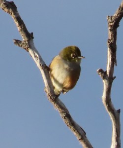 Two Silvereyes perched on a twig, lending a touch of colour to the winter chill. Here’s one of them, showing the buff colouring on its front, under the wings. And, of course, that characteristic white-ringed eye: