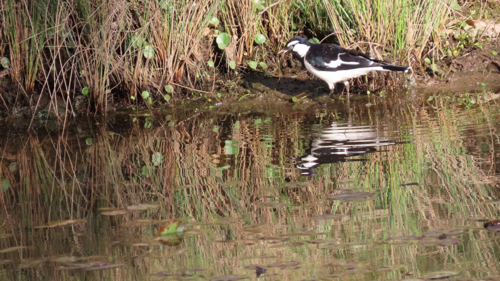 A few weeks ago, I watched a pair of Mudlarks building their nest. Mudlarks get their name from their construction of nests made of mud and reeds. Despite their name, Mudlarks are not larks. Another name for them is Magpie-larks — but they’re not Magpies either! Yet another name for them is Peewees, which is an imitation of the noise they make: pee-wee, pee-wee.