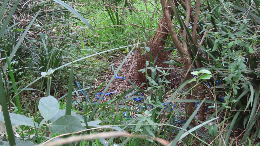 I examined the ground in the area where the male was hanging out, and managed to find his bower. I was careful not to go to close. He had arranged some dead grass into an architectural gateway, and scatted plenty of blue plastic pieces around. A fitting lure for a female beauty: