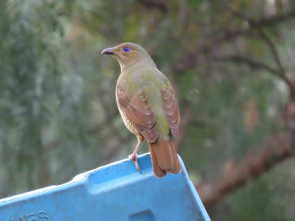 That purple eye isn’t a trick of the light. This bird really does have purple eyes. It’s a female Satin Bowerbird. My first sighting!