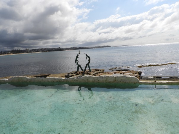 The Oceanides, or The Sea Nymphs, is a graceful sculpture on the edge of the sea pool at Cabbage Tree Bay in Manly. Today a Little Pied Cormorant added its grace to the work of art: