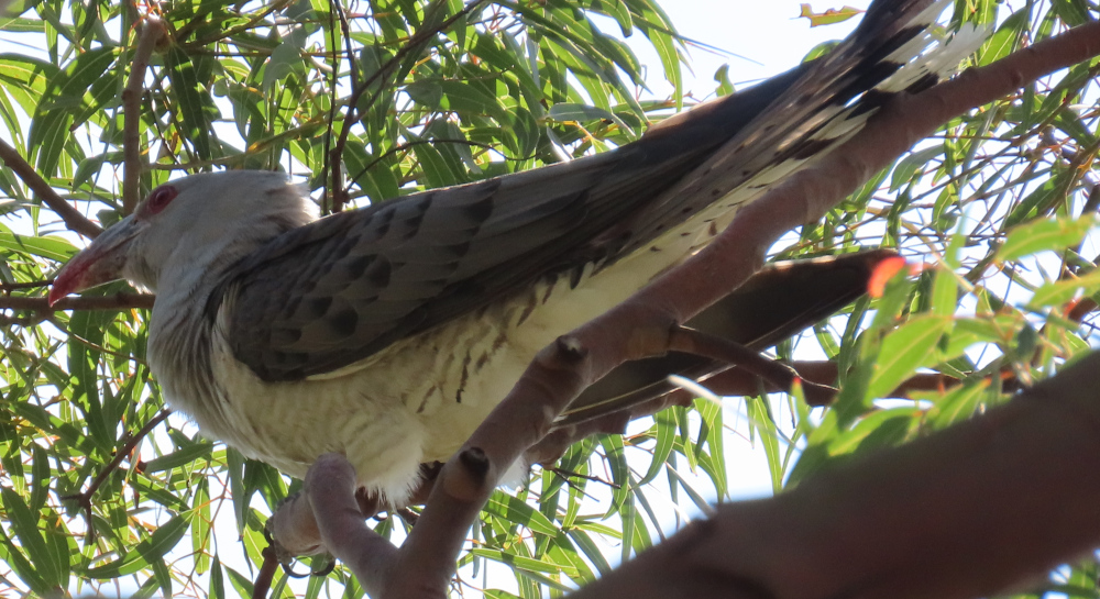 Like most cuckoos, Channel-billed Cuckoos are parasitic. They don’t build nests of their own. Instead, they look for a likely host (a Currawong does very nicely, thank you) and lay an egg in the chosen host’s nest. The Currawongs take over all parental duties, looking after the egg along with those of their own, then feeding the baby bird.