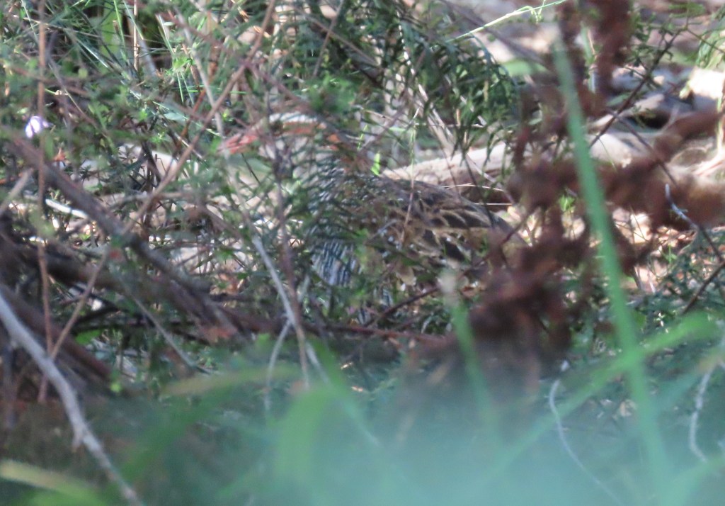 The bird has a distinctive wide white eyebrow, with a chestnut stripe through the eye. The top of the head is a darker brown, and the beak is orange and quite long. (At first I thought the bird was some sort of quail, but I couldn’t find any quails with orange beaks.) The body has black and white barring on the sides, whereas the plumage on the back is mottled brown and cream.