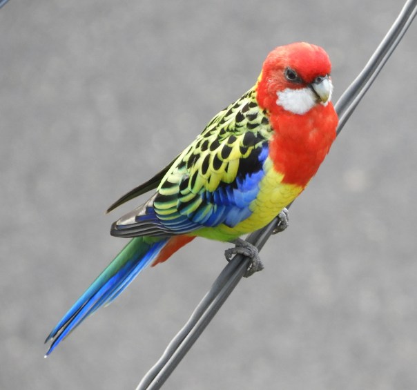 This pretty little parrot perched on an electric cable outside my window. Eastern Rosellas don’t come round often, so it’s a treat to see one.