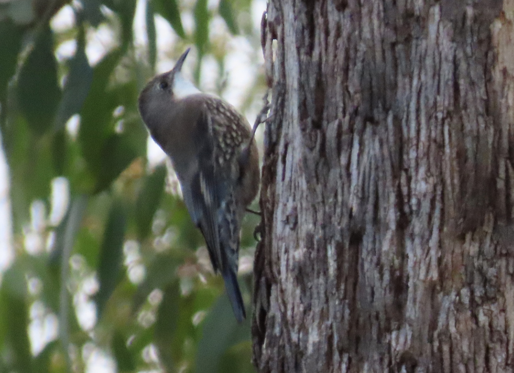 The bird sped up a tree trunk, dashing from side to side of the tree. Its white throat flashed in the dim light. The rest of the bird is mottled grey and brown, merging well with its surrounds.