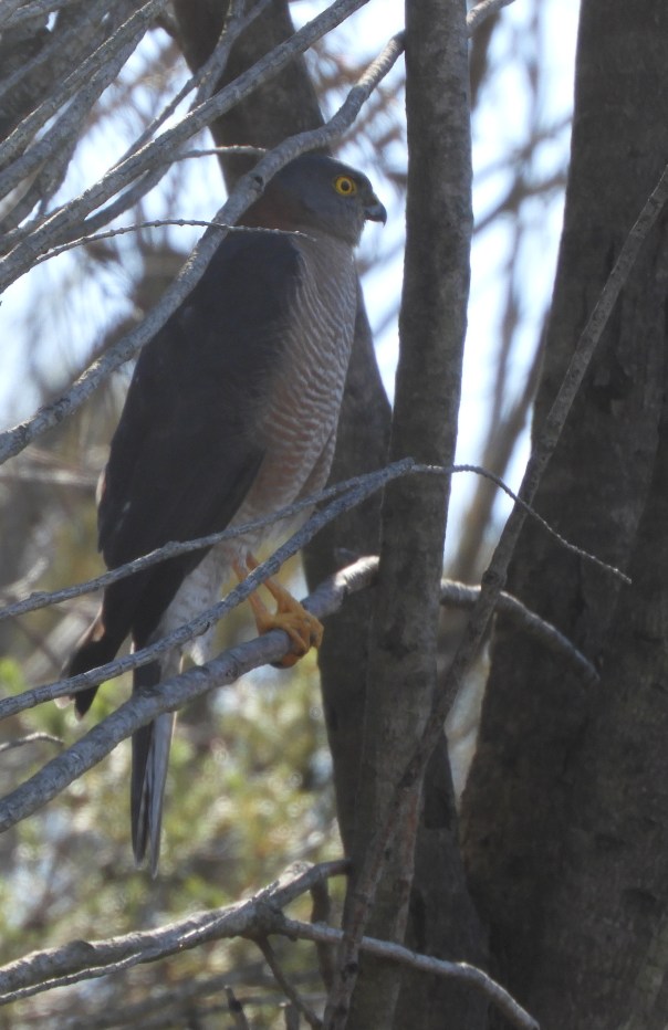I think it’s a sparrowhawk, but it could be a Brown Goshawk. They’re very similar in appearance. Collared Sparrowhawks have a very long middle toe. This was the only photo I managed to take before the bird flew away, and the photo doesn’t show the toes too well. Brown Goshawks are larger than Collared Sparrowhawks, but it’s hard to judge the size of a bird.