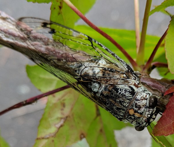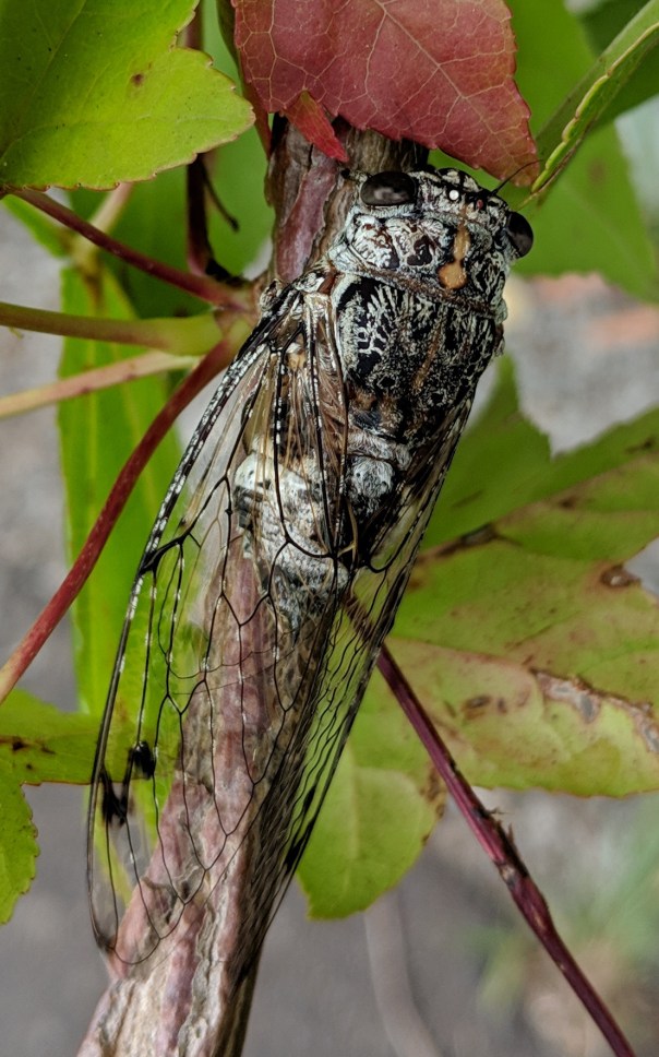 They have an impressive life cycle. The adult cicada is the winged insect we see, and it lives for only a few weeks. But the nymphs, which are the form of the creature that hatch from the eggs, live for around seven years, underground. A previous post of mine has pictures of the empty husks left behind when a nymph transforms into the winged adult.