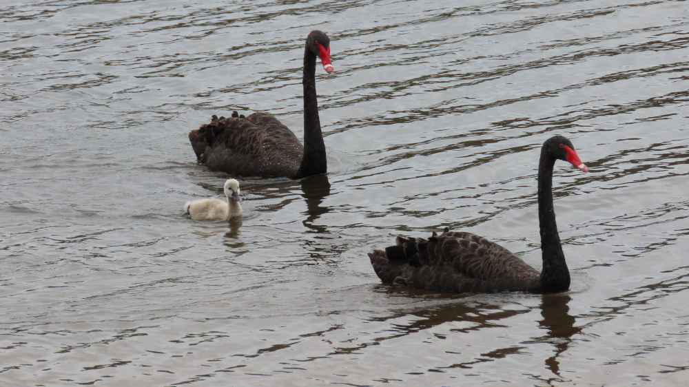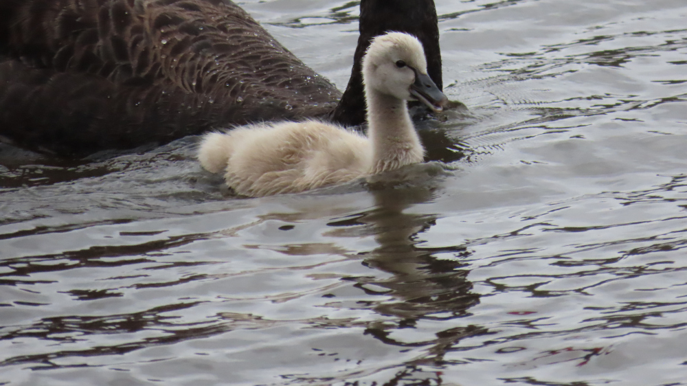 This video from December shows the little one bravely battling the choppy waters of the dam where they live. If you listen carefully, you’ll hear the cygnet cheeping continually. The rushing sound is the wind: