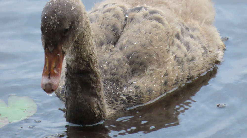 Early in October I spotted a family of swans at Manly Dam. These are Australian Black Swans. When I first saw them, there were five baby swans (cygnets), closely watched over by two adults. This was one of the little ones, just a few days old then, I think: