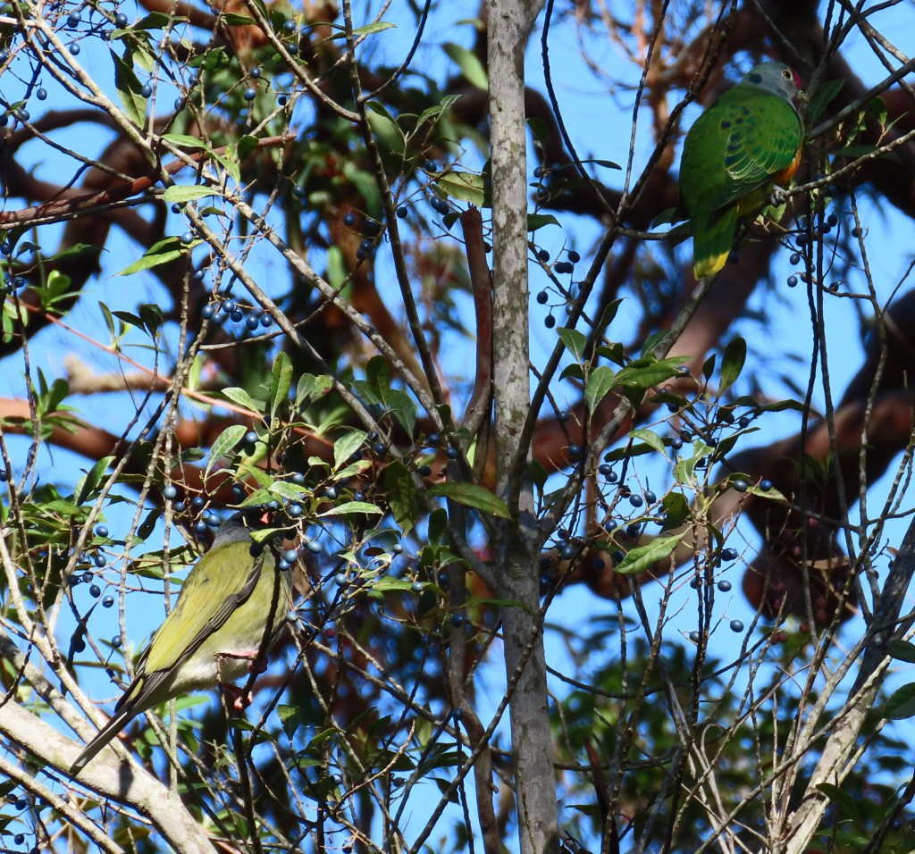The dove had some competition for the berries from other birds. In particular, a group of figbirds moved in and started a bit of a squabble. The next photo shows the Rose-crowned Fruit Dove at top right and a figbird at bottom left. The photo gives a good view of the dove’s emerald green back: