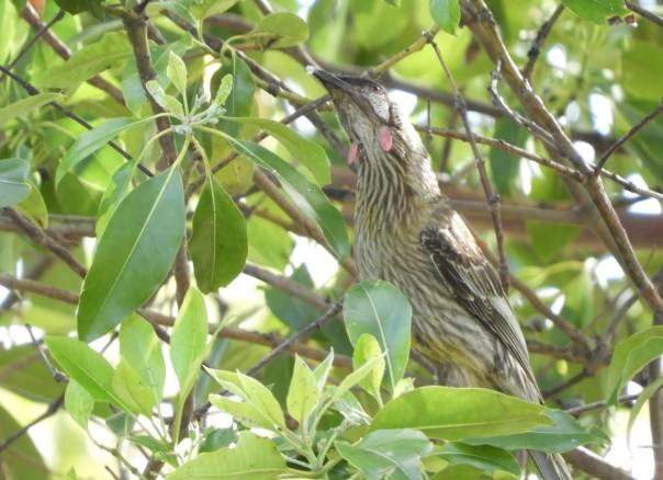 Red Wattlebirds are large honeyeaters, often seen diving through the foliage and chasing other birds away from a prized source of sugar. This one was making a lot of noise crashing through the branches. Probably on a sugar high. I think the white fuzzy stuff attached to its beak is lerp – crystalised honeydew exuded by bugs as a protective covering. A sweet treat for a bird. Red Wattlebirds get their name from the red wattles hanging below each cheek.
