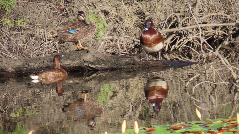 This male Hardhead (on the right of the picture) looks like he has something to say. To his left, a Pacific Black Duck seems mildly surprised, or perhaps just living up to his scientific name, Anas superciliosa.