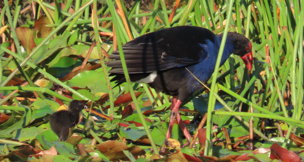 I don’t know whether these birds are male or female, so I’ve just picked pronouns at random. Both sexes of Purple Swamphens look after their young, and they’re hard to tell apart.
